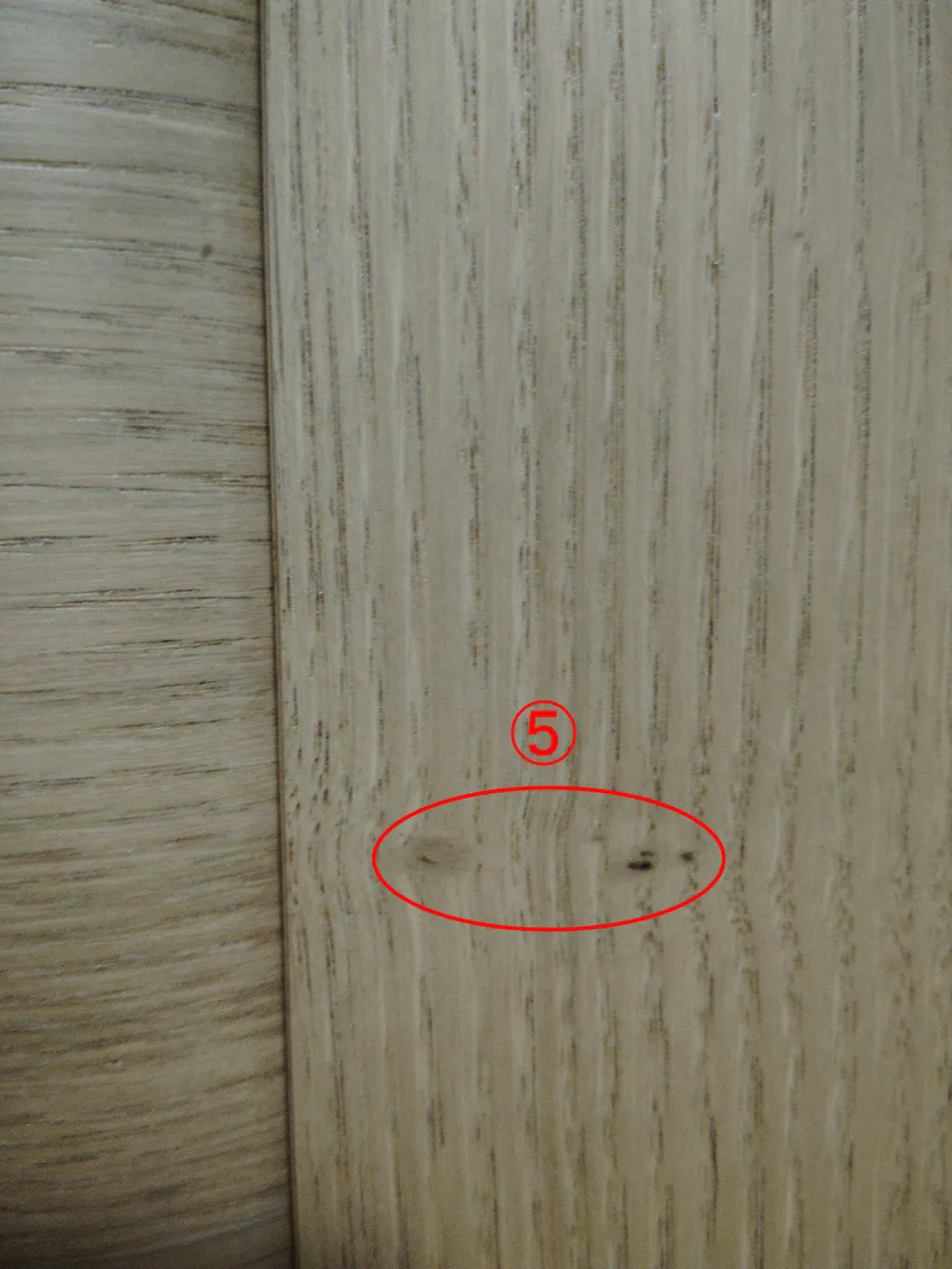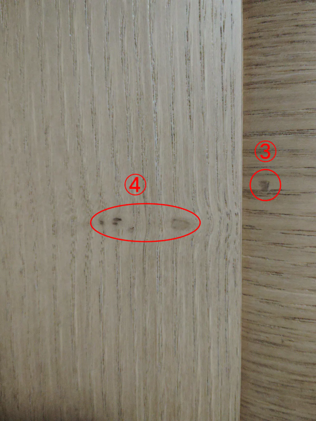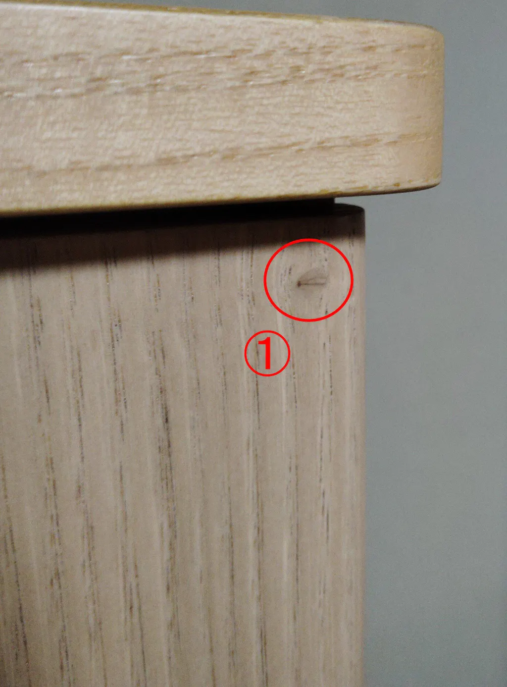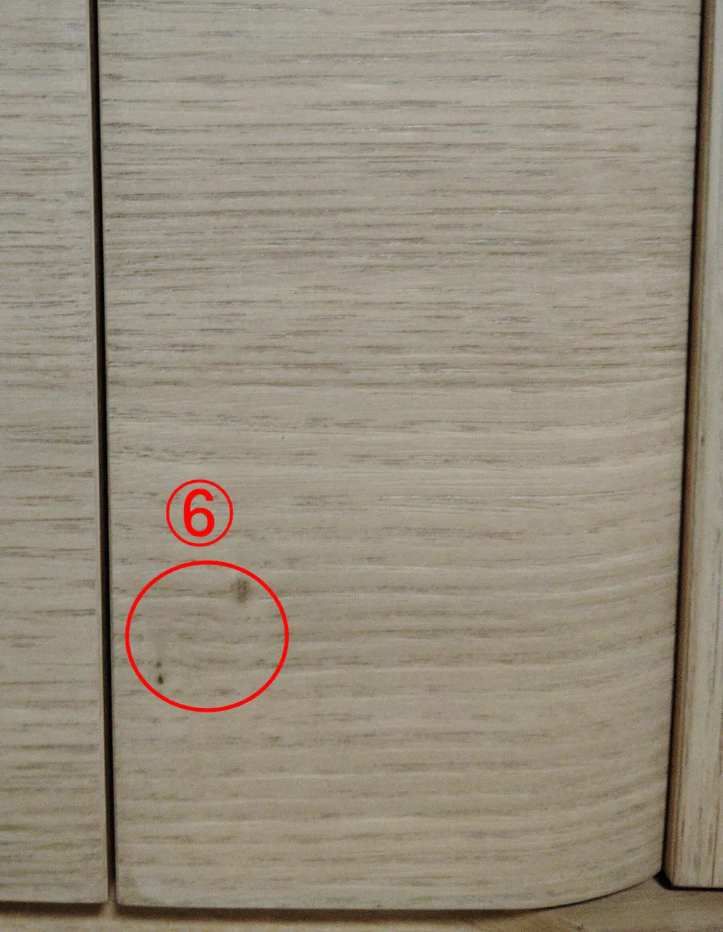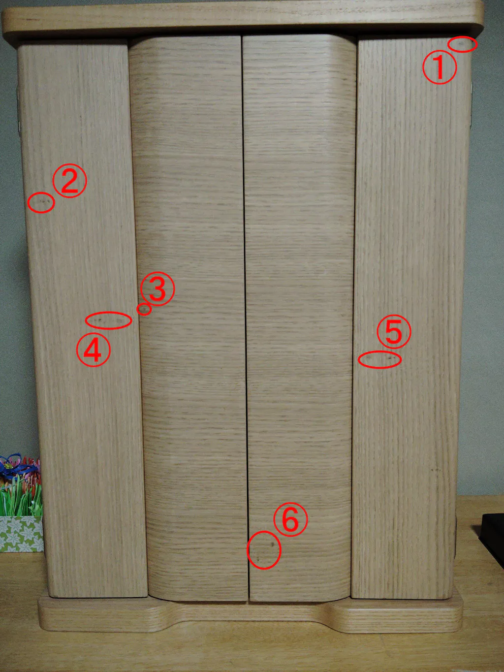 高さ34cmの繰り出し位牌(回出位牌)が入る上置き仏壇を探してました。 仏壇の大きさは期待通りでサイズ的には満足しています。色合いは思ったよりも明るい色でした。扉は開けたときに横に開いたままで側面と平行にはなりませんが、問題はありません。 しかし、折りたたみ観音扉に木目の節と思われるものが6ヶ所あり、気になります。特に⑥は扉を開けたとき目立ちます。色合いは下台にするチェストの入りに合わせて「クリ」にしましたが、これならばウォールナットにすればよかったと後悔しきりです。注意書きなどには、木目違いの記載はありますが、この節についての記載は見当たりませんので、注意書きに記載されたほうがよろしいかと思います。